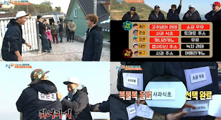 Without wasting time, each member hiked up highest of the village to hide from each other. Everyone is afraid of Shi Yoon as he is a fast runner. Jun Ho tries to team up with Jong Min however he failed the mission terribly. His name tag was first ripped off by Defconn. It was a hide and seek game to test the fastest and ruthless of all. Defconn drank the cider vinegar drink and despite that he still lost out. Tae Hyun was 2nd best and it came down to Shi Yoon and Jong Min. Unfortunately Jong Min was too slow in ripping tags and he joined Jun Ho as the losing team. They get neither lunch nor dinner. Awww....He pouted with disappointment since it's a special episode on him yet he needs to starve. The staffs gave the two losers a chance- they pick a cup/glass and the get to eat 'cup rice'. However first the two need to peel off the head and guts of the dried anchovies filling up the cup/glass they picked. Jun Ho being greedy picked a medium size popcorn bucket struggles to fill it up while Jong Min easily filled up the beer mug. He gets a nice portion of rice, soup, fish and side dishes in the mug.